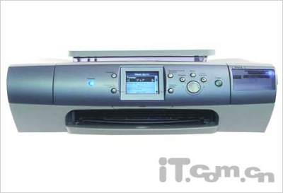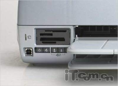 對于照片打印機來說,最重要就是它一般都設計內(nèi)置了數(shù)據(jù)讀卡單元,能夠在不連接計算機的情況下,可直接讀取數(shù)碼相機存儲卡中的照片數(shù)據(jù)并進行打印??梢詮膱D中看到,在Photosmart 7268前面板上提供的一組存儲卡插槽,這一組存儲卡插槽,能夠直接讀取CompactFlash、SmartMedia、Secure Digital、多媒體卡以及記憶棒等主流類型的存儲介質(zhì)。另外在插槽旁邊也提供了提供了打印10×15cm照片和打印照片拼頁的按鍵,接讀取數(shù)碼相機存儲卡中的照片數(shù)據(jù)并進行打印。
